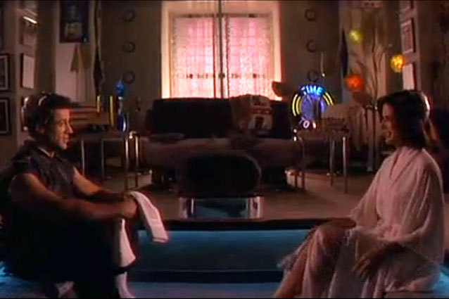 sex sceneSpeaking of which, this is the scene that immediately precedes that phone number. Spartan and Sandra Bullock’s Lieutenant Lenina Huxley have gone to her apartment to have sexual intercourse, which for Spartan means the more traditional “hunka-chunka” fluid transfer method, but for Huxley involves helmets, towels and being the other side of the room from your partner. You see, sex in the future in undertaken via arousing images and flashing, epiplepsy inducing colours and sounds which simulate sex, without actually requiring physical contact. Brilliant.