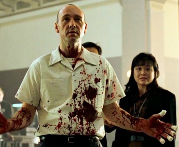 SevenDamn do I love Seven. I’m pretty sure it’s in my top 10 films of all time. It’s got so much going for it – the A-list buddy cop partnership of Brad Pitt and Morgan Freeman, horrific deaths (of which we only ever see the aftermath), a terrifically gruesome opening credit sequence, R. Lee Ermey as the most belligerent police chief ever, and of course the introduction of the killer, John Doe, as shown above. His strolling into the police station, splattered with the blood of his latest victim, bellowing “Detective!” at the top of his voice. Damn it’s good. And that ending. Still gives me chills.