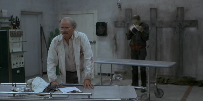 As with the previous two films in the franchise, this takes a similar premise – a disparate group of people attempting to survive in a confined location after a zombie outbreak – and just leaves them to it. Here though the stakes are raised somewhat by both the number of people – there are twelve surviving there as we enter the film, with several already having been killed – and also the kinds of people they are. Of the twelve, three are scientists – Dr. Sarah Bowman (Lori Cardille), Dr. Ted Fisher (John Amplas) and the aforementioned Dr. Logan. Two are civilians – the Jamaican helicopter pilot John (Terry Alexander) and Irish radio operator Bill (Jarlath Conroy). The other seven are military, led by newly appointed and perpetually angry Captain Rhodes (Joseph Pilato), and including the brutish bigot Pvt. Steele (Gary Howard Klar), his giggling sidekick Pvt. Rickles (Ralph Marrero) and frenzied Pvt. Miguel (Anthony Dileo Jr.), who is sleeping with Sarah, much to the others’ distress. With Miguel and the two civilians allying with the scientists, it presents a six-against-six dynamic when heads butt as to what course of action should be taken, and given the amount of weaponry and zombies in close proximity this leads to some pretty tense altercations.
