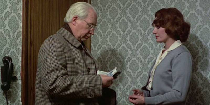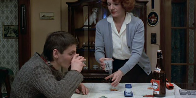 So what’s the problem here? Well, the film’s aim, I believe, is to portray the intense boredom and monotony experienced by Dielman (Delphine Seyrig), the futility of her existence, and how suppressing this realisation can lead to extreme actions. To show this we’re given access to the minutiae of her day, and when I say access I mean we sit and watch her peeling potatoes until all the potatoes are peeled. She also knits. And cleans. After the first gentleman caller leaves, we watch her take a bath, in its entirety, then get out and clean the bath. This sequence is particularly uncomfortable as Dielman is naked and oblivious to our presence, as though we’re watching through a keyhole. On the first evening, after her son Sylvain (Jan Decorte) arrives home, we watch them eat the whole of their dinner at the table, mostly in silence. That’s the whole soup course, then we watch Jeanne go to the kitchen, plate up the main, then return to the table and eat all that too. It was here that we had our first incredibly tense moment of drama when, after finishing the meal, Jeanne goes to take Sylvian’s glass, but he hasn’t finished with it yet! He reaches out and snatches it away before she can remove it, before hastily gulping down the remaining drink and handing it over, whilst his mother waits with an impatient look on her face. Oh the tension!
