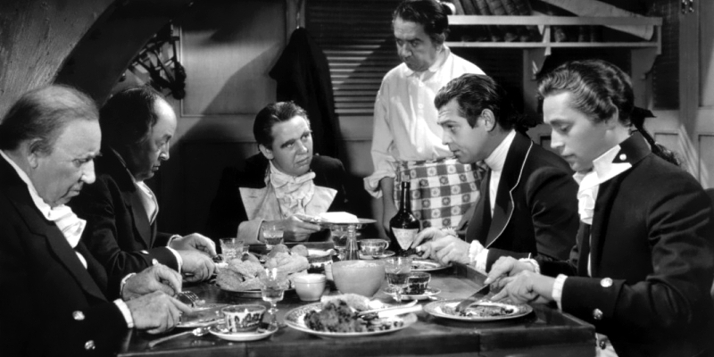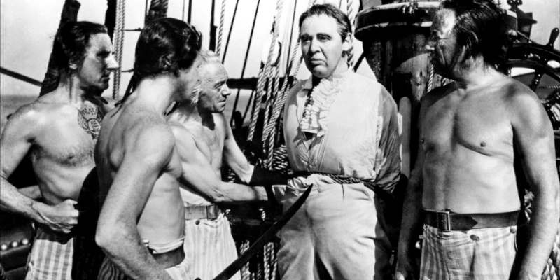Despite this being only the second film I’ve seen him in, Charles Laughton is rapidly becoming one of my favourite classic cinema villains, after his stellar work in Jamaica Inn and the utterly depraved and horrendous acts he performs in Mutiny, Laughton is so ludicrously vile that it becomes entertaining to hate him. His Capt. Bligh has no qualms about doling out the strictest and most unfair punishments for the slightest infringements. A man is given two dozen lashes for not speaking up when someone else knocks something over. Another is flogged for being late to see the captain, despite the tardiness being the fault of a fellow officer who owns up to the misdemeanour, only to be put in charge of the crewman’s flogging. Hell, we’re introduced to the Captain when he insists on a man being given two dozen lashes in front of the rest of the crew, despite that man already being dead! You know you’ve got a real boo-hiss villain on your hands when there’s an entire montage devoted to the painful and at times fatal injustices he orders on a somewhat regular basis.