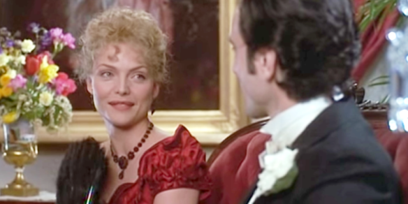 This is the kind of film that has a great deal going for it. The costume design is incredible – as is to generally be expected with period dramas – and deservedly picked up an academy award, although it does occasionally fall in line with the cliche of a woman’s dress colour emphasising her character, with Pfeiffer dressed in seductive, alluring scarlet compared to Ryder’s demure, virginal white. The production design, music, hair, make-up, everything has been groomed to perfection and a tremendous amount of effort in all areas is evident on screen, but alas the overall film suffers from a lacklustre script.