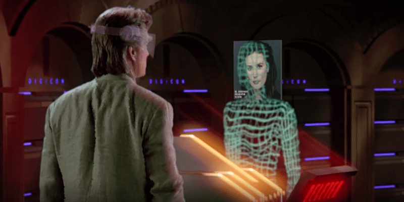 Tom knows there’s a means of accessing the company network through a terminal that’s been set up as a demonstration for potential clients, and is currently in their hotel room. The only problem is, it uses their new fancy virtual reality network exploration system. That’s right, Michael Douglas has to enter a virtual reality system – an early 90s virtual reality system, at that – to find incriminating video footage of Demi Moore making risky business decisions. If you’ve seen the “Jesus wept!” episode of Community, which absolutely has to be a parody of this scene, you’ll have some idea of what we’re dealing with. It’s ancient Greek architecture. It’s terrible CGI. It’s a cardboard cut-out of Demi Moore floating through the world, hunting Michael Douglas down like she’s Michael frickin’ Myers. Douglas appears as a 3-dimensional real-world version of himself, but Moore is flat, inexpressive, and terrifying. I cannot properly express the utter glee I experienced whilst watching this marvel of cinema. It’s amazing. We see Moore sat at her computer terminal, accessing, moving and deleting files at the standard speed at which these tasks could be completed in 1994, but her in-computer avatar moves glacially, like she’s using Windows ME. My wife did not watch this film with me, she’s far better at decision making than I am, but after the film I had no choice but to sit her down, skip back a few chapters and just let her experience the glory of this sequence.