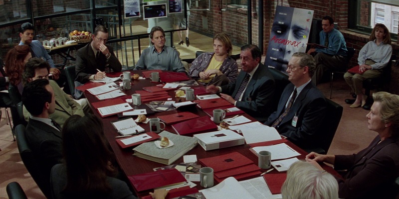 Oh, I completely forgot, there’s a bit where Tom has a nightmare about Bob – who, let’s not forget, is played by Donald Sutherland, and is absolutely killing it in this film, I love Sutherland villain roles – coming onto him in the elevator the day after the meeting with Meredith. It’s like Tom has finally seen the light on how women might feel in a male-oriented business environment. Is a lot of time spent on this? No, absolutely not, don’t be so ridiculous. Instead Tom has a breakdown speech about how sexual harassment is about power, something he never had. Except for the part where he’s slapping his secretary’s butt with his clipboard.