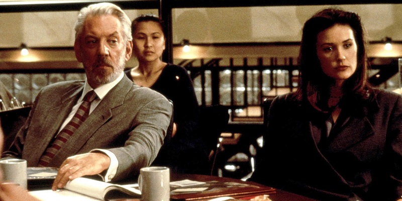 Tom (Michael Douglas), a devoted husband and father, has spent years working his way up the corporate ladder at a technology company, and is expecting to be promoted as part of an upcoming merger. However, instead his boss Bob (Donald Sutherland) brings in new blood for the role, in the form of Tom’s ex-girlfriend Meredith (Demi Moore). Meredith summons Tom for a suspicious evening meeting accompanied by wine and shoulder massages, during which she attempts to seduce him. After initially reciprocating, Tom eventually turns her down and flees, telling no-one and hiding the scratches on his torso. Upon arriving at work the next day Tom discovers Meredith has vengefully accused him of sexual harassment, and Tom must either prove his innocence or be forced out of the company.
