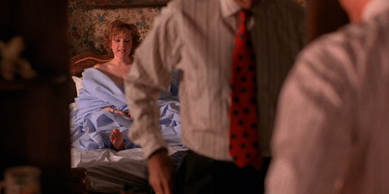 Just look at Ray Wise lingering in this doorway. How can you not suspect him of some kind of foul play? He’s not grieving at all, whilst his wife is utterly distraught (understandably), so much so that she mistakes Donna for Laura. Is it possible that Mr. Palmer is drugging his wife with some kind of hallucinogen?