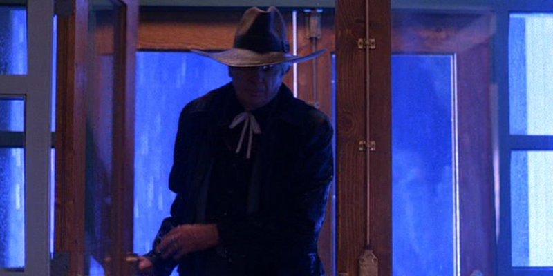 Hank attends to someone banging on the window of the Double R, it’s cousin Jonathan waiting inside in darkness, dark suit and sunglasses. Hank utterly fails to land a hit on the guy with fists or a torch, gets roundly laid out on the diner floor. “Next time I take your head off”