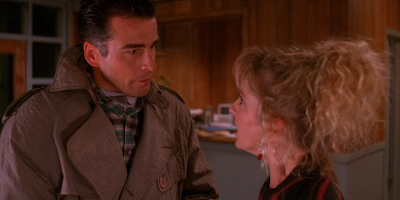 It takes 15 minutes for last episode’s diary cliffhanger to be brought up! Harold (Lenny von Dohlen) volunteers to read from it, picks a section in which Laura talks about her positive thoughts about Donna (Lara Flynn Boyle) but also her own fears. Suggests giving it to the sheriff, Harold says no, he’s read it “from cover to cover” and there’s no solutions in it. Says Laura gave it to him. This all sounds like utter bollocks and Harold is lying his arse off.