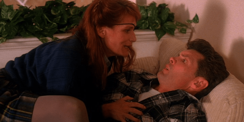 Nadine (Wendy Robie) thrilled she got to use a credit card, got the house alone so they can fool around right there, punches Big Ed (Everett McGill) in the gut then throws him on the sofa, leaps on him, he terrified.