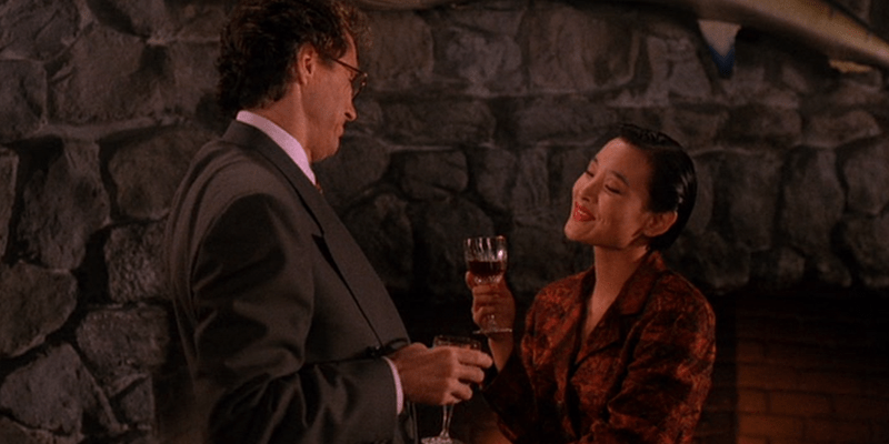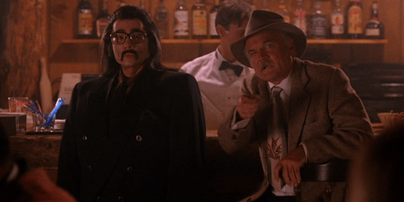 Mr. Tojamora is Catherine! I’m certain that’s Piper Laurie. I assumed it would be Josie because otherwise the make-up is even more problematic, but it was 1991, so who knows? A serious meeting between Ben and Mr. Tojamora is interrupted by Leland singing Getting to Know You, lounge singer-style, he dances with Ben when he tries to interrupt, they end up duetting. Pete (Jack Nance) at the bar next to Mr. “Tojamura”, spins around “The King & I!” Pete to Tojamura “You’re not from around here, are ya?” This interaction makes me certain it’s Catherine. “Can I buy you a sake? How ’bout a nice cold milk?!”