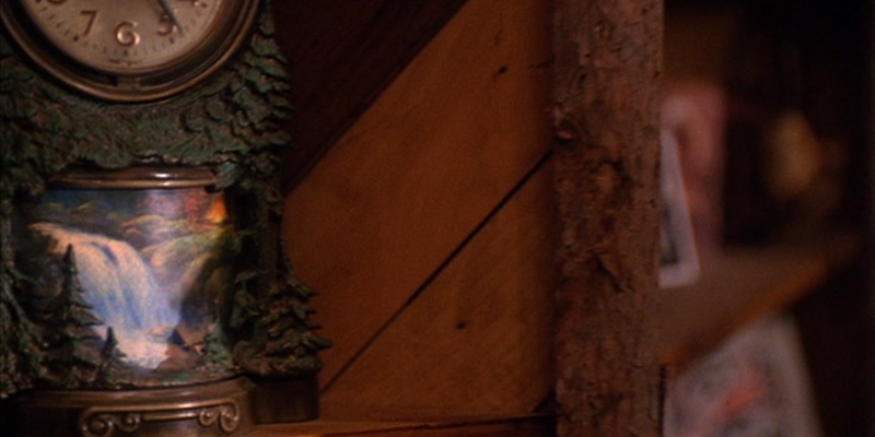 At the Palmer place, the camera focusses briefly on a four-pillared clock on the mantlepiece. After the tacky waterfall earlier, is this the shelved clocks episode? Maddy, Leland and Sarah (Sheryl Lee, Ray Wise & Grace Zabriskie) are having coffee with the morning papers. Maddy tells them she’s leaving, heading home tomorrow, they’re mostly ok about it.