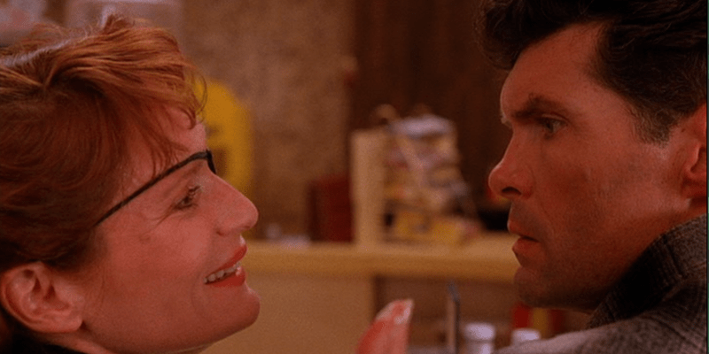 Audrey (Sherilyn Fenn) confronts her father (Richard Beymer) about One Eyed Jacks, reveals she was the white-masked Prudence! Ben taking this somewhat well. He’s owned OEJ for five years, he knew Laura worked there but only for a brief time, Emory sent her there. “Did you sleep with her?” Looooooooooong pause, sigh, “Yes”. “Did you kill her?” Another long pause – longer than it should be – “I loved her.” Forlorn Ben, the most emotional he’s been.