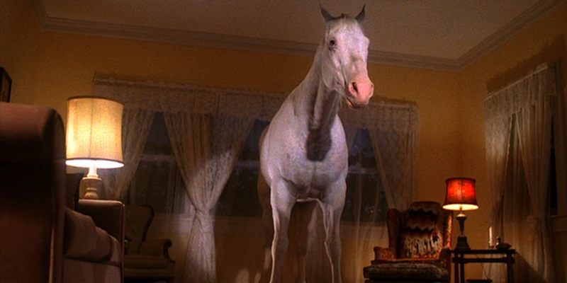 Sarah is still crawling, has a vision of a white horse in her living room. It snorts, fades out, she collapses. Record player still spinning, Leland nearby tying his tie, oblivious. This feels important.
