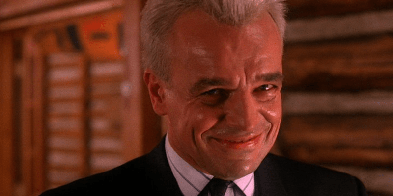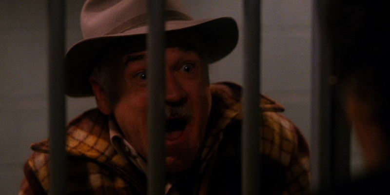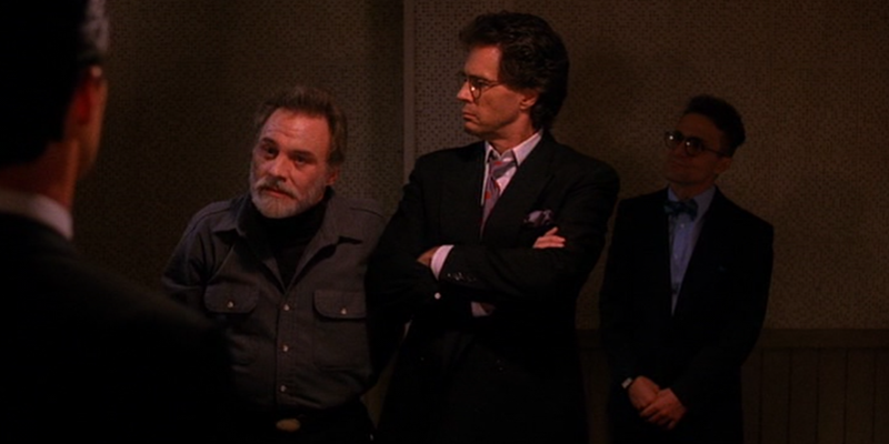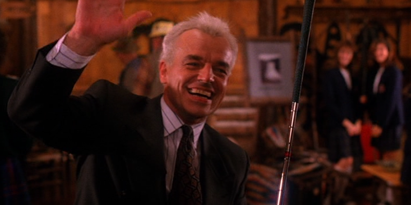 Cooper (Kyle MacLachlan) is dictating to Diane in the company of Harry (Michael Ontkean), both just left Gerard (Al Strobel) the one-armed man (“What’s left of him.”) Leland is entertaining the extras, dancing in the hotel lobby to no music. They tell him they’ve arrested Ben for Laura’s murder. He’s visibly upset, crying into his golf club handle, but very happy upon leaving them. HOLD THE PHONE, HE JUST LOOKED AT THE CAMERA!? Is Bob a Deadpool? Does he know he’s in a TV show? Cooper suspects something. Bob-Leland golf club cane dances away.