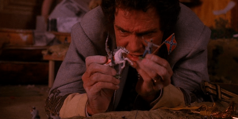 Audrey (Sherilyn Fenn) is concerned about Ben’s new war re-enactment obsession. Taken over the floor of his office, seems to have injured an assistant of some kind, hurried off with a flesh wound. Discarded plaster of paris boxes, Audrey calls Dr. Jacoby for help.
