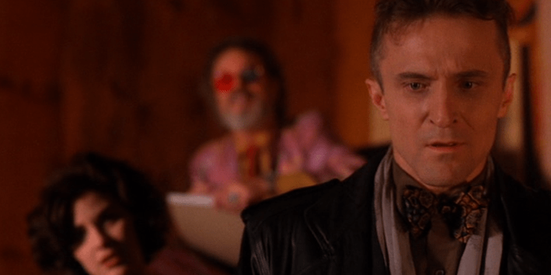 Leo in the woods, owl flies overhead, about to become inhabited by Bob? Stumbles upon a cabin, inside is a man who I’m assuming is Windom Earle (from credits), with a selection of blow darts? Invites Leo in. Sits down at a chess board, “You can call me Windom, Windom Earle.” I’m glad he confirmed he’s Windom Earle, and not some other Windom. Could’ve been anyone.