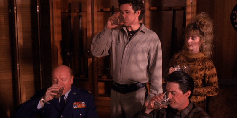 Pete (Jack Nance) reviewing a shopping list “we forgot the weenies!” Catherine (Piper Laurie) reveals how she survived the fire and orchestrated taking the mill from Ben, reveals Andrew (Dan O’Herlihy), alive and well in the back room. Pete understandably quite surprised “Now let me get this straight, you didn’t die in the boat accident?” Didn’t tell him because he didn’t need to know, pre-emptive disappearance as they expected an attack on Andrew’s life, from Thomas Eckhardt. Also reveals Josie (Joan Chen) worked for Thomas, and Thomas coming for Josie “like a rat for cheese”.