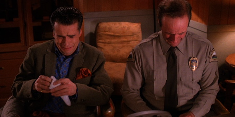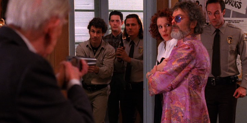 Cooper playing a game of chess in which Windom kills someone with each piece he captures. Cooper never beat him on any of their daily games, which presumably didn’t have a body count associated with them. “I brought some baggage to town I haven’t told you about. Windom Earle was my first partner.” Reiterates the story of Caroline, witness who’d been stabbed under his watch, wounds matched those on Windom’s victim. Caroline was Windom Earle’s wife, oooooo. Harry (Michael Ontkean) assumed Windom blames Cooper for her death, but Cooper believes Windom was the one who killed her and committed the crime she witnessed, possibly even faked the madness that had him in the asylum.