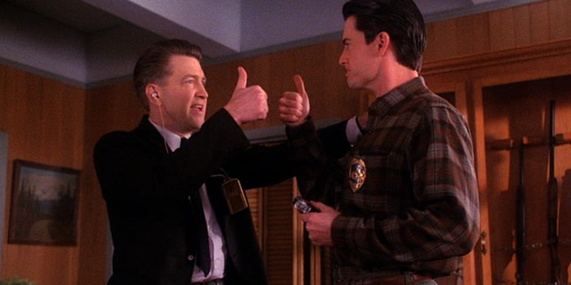 Windom and Leo (Kenneth Welsh & Eric DaRe) listening in on the bugged bonsai. Cole reporting loudly on Windom’s drugs for schizophrenia, the same as Gerard used (where is Gerard, anyway? looking for Bob? No-one else is!). The easiest conversation to pick up, two guys yelling and enunciating at each other next to the tree, laughable. Turns out Earle was investigating UFOs, like Major Briggs. Cole also reissues Cooper with his badge, new gun, back in the FBI. “We shall pursue, capture and incarcerate.” Then go for breakfast.