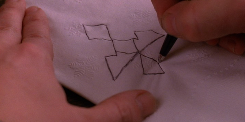 Cooper drawing the twin peaks symbol on a napkin. Debates bird species, corrected by Annie (Heather Graham), who recommends “Teetotalism and prayer” for a hangover, one of those people. Harry clearly sees chemistry between Cooper and Annie. Harry orders a chicken pot pie for breakfast, what is this place? Harry turns the tables, “How long you been in love with her?” Cooper tells her a bad joke, she laughs at it, so she’s into him too. Cole and Cooper both in love, Harry’s former love barely cold in the morgue, it feels a little mean for Cooper to be rubbing it in his face like that. Napkin drawing reminds Annie and Harry of Owl Cave.
