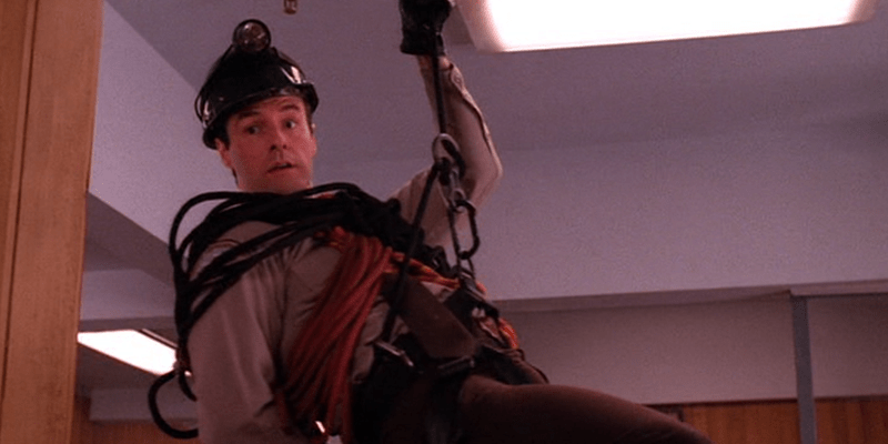Lucy (Kimmy Robertson) is once again impressed by Andy’s (Harry Goaz) handiness, in full spelunking gear coming down from the ceiling. He helped her in the fundraiser debacle, “Unlike a certain Dick we all know”. He spelunks right past her, through the floor? Harry and Cooper also gearing up for a mining expedition.