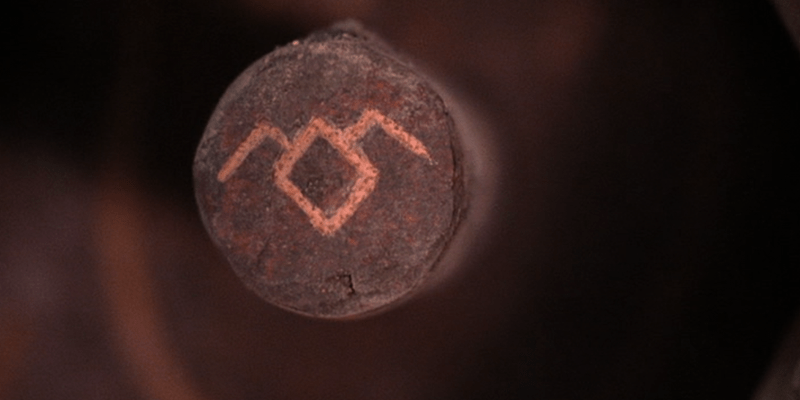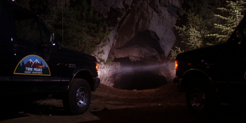 Andy, Harry, Cooper and Hawk (Michael Horse) at the cave, Andy not very good at this rock climbing lark, even when barely off the ground. The symbol is carved on the cave wall. Three diamonds combined with the twin peaks, topped with a fire. Shot of an owl. An owl flies into the cave, Andy takes a swing at it with his pickaxe, gets it stuck in the wall, causing one of the diamonds in the symbol to OPEN, WHAT. A pole emerges with a new symbol on the end, looks like a simplified own in flight, or a diamond in front of two mountains, twin peaks, if you will. As it’s a straight-line carving, the diamond could also be a circle, maybe a lake or a cave, a hole of some kind? Owl flies out of the cave. Is that Bob?