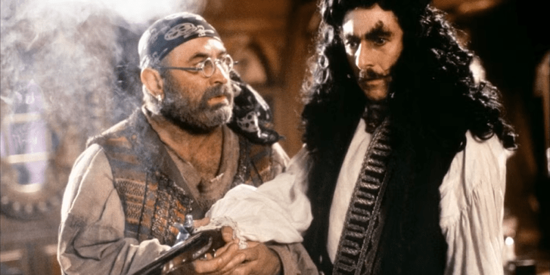 When we get to Neverneverland things do certainly pick up. The sets are inarguably impressive, there’s actual action and entertaining sequences, and we get the MVPs of the film, Dustin Hoffman and Bob Hoskins emptying out the entire butcher’s worth of ham as the eponymous Captain Hook and his first mate Smee. These two are a delight, every scene they’re in has energy and campiness to it, and I miss them whenever they’re gone. It doesn’t help that I kind of hate everything with the Lost Boys, and why everyone is so obsessed with Rufio (Dante Basco) I’ll never know. He’s fine, whatever.