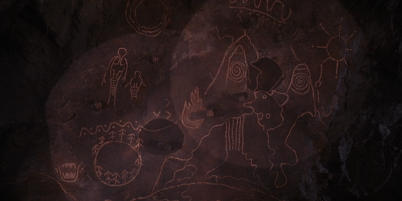 Cooper, Harry, Andy and Hawk (Kyle MacLachlan, Michael Ontkean, Harry Goaz & Michael Horse) are back in the cave, find Windom’s tracks and evidence that he’s been there and tampered with the wall carving, or “pentagraph” as Cooper calls it, requests Andy do a full carving.