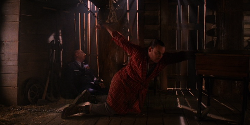Andy (Harry Goaz) sees something in the cave painting drawing. “With your permission, I’d like to speak out loud.” Windom licking his lips, listening in via the bonsai tree microphone. Cooper (Kyle MacLachlan) believes Josie died from fear, quaking, tells Harry (Michael Ontkean) he saw Bob (Frank Silva) at Josie’s death, she died from fear of Bob, he comes from the black lodge, “the evil in these woods, there is a source of great power there, far beyond our ability to comprehend.” And he’s just unwittingly told Windom pretty much where it is. “It’s fear Leo, my favourite emotional state! They’re drawn to us when we radiate fear!” The time has come to gather my beloved queen and embark upon our dark honeymoon. I haven’t been this excited since I punctured Caroline’s aorta.” Cooper was right, Windom killed Caroline. He leaves Leo strung up, a taut string in his mouth holding A BOX OF SPIDERS!