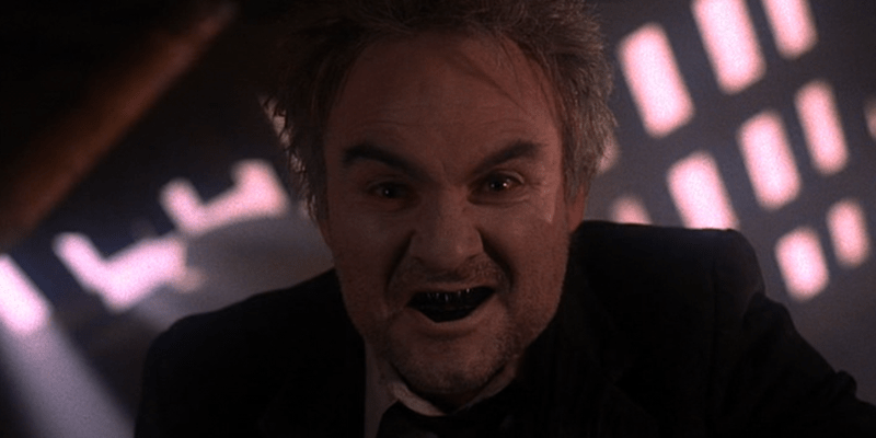 Leo and Briggs (Eric DaRe & Don S. Davis) are chained up in Windom’s cabin. Leo reaches the key, but only for Briggs’ shackles, tells him to “Save Shelly”, motivated by someone else wanting to do harm to her, that’s his job! Windom (Kenneth Welsh), pale-faced (what disguise has he been in? A snowman?) offers no punishment for Leo for freeing Briggs, Windom believes he wont be able to do anything for his plan, but he has a “new game” for Leo, brandishes a small tied hessian sack, then pulls this horrific visage: No thank you!