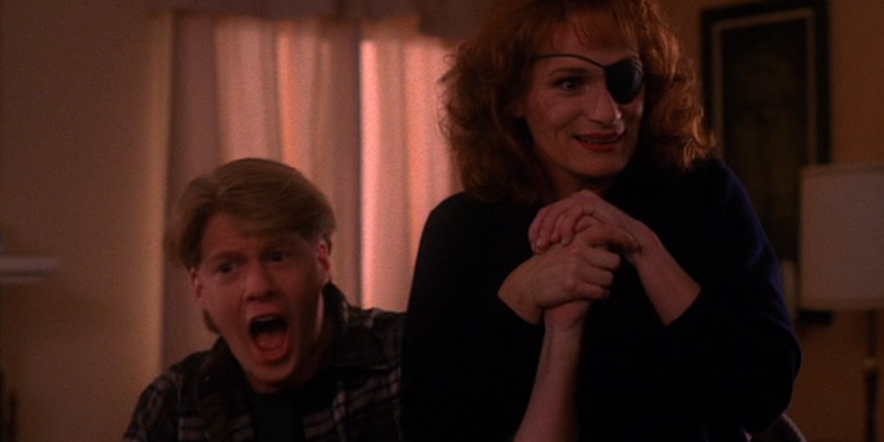 Nadine (Wendy Robie) is giving a slideshow on her wrestling prowess to Norma, Mike, Ed, and Jacoby (Gary Hershberger, Everett McGill & Russ Tamblyn). Session run by Jacoby, discuss her and Ed wanting to div- break up, talk about their feelings in front of other people. Nadine concerned that Ed is sad because she’s so happy, but Ed reveals to her that he and Norma are getting married, so she retaliates that she and Mike getting married too, and stress-breaks his hand in the process.