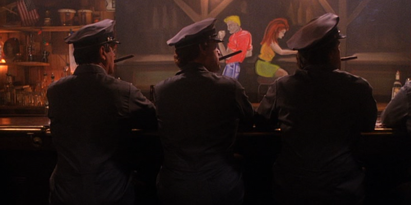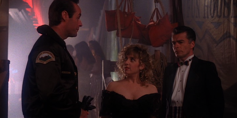 Harry (Michael Ontkean) is in bed in a drunken stupor, is Jones (Brenda Strong) coming onto him in his sleep? She gently caresses a bottle at her hip, dabs some of the contents on his lips and hers, then they kiss. He sees her as Josie (Joan Chen)! Then she pulls out the wristwatch wire and chokes him! He manages to overpower and punch her out, then cut to the waterfall – did he have sex with her unconscious body? (I think at this point the cut-to-a-waterfall-symbolising-sex thing might just be in my head.)