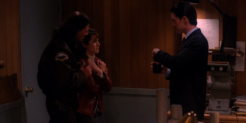 Harry (Michael Ontkean) is dreaming of Josie (Joan Chen), drinking through an artfully-lit glass silhouette, in darkness. I just need to take a moment to dwell on the fact that the last time he saw Josie she spontaneously died in front of him, and the last time we saw Josie she was screaming from inside the knob on the drawer of a bedside cabinet, and if this is never fully explained I will remain furious forever. Hawk (Michael Horse) delivers Harry breakfast from Norma. “It’s a pretty simple town; least it used to be. The world’s caught up with us.”