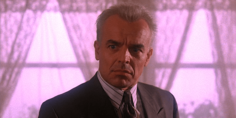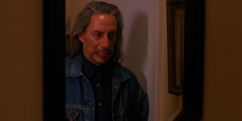 Donna visits the Palmers, gives Leland (Ray Wise) the tape of their singing session (someone please burn it), he says it won’t be any problem at all to mail it to Maddy, then recognises Laura’s sunglasses. Donna tells Leland about Laura’s secret diary at Howard’s, now with the police. Receives phone call, says he hasn’t heard from Maddy since yesterday, took her to the bus station herself, “She never made it home”. Leland chews on some gum. Straightens his tie, again, Wildman Bob (Frank Silva) reflection. Later, plays with Donna’s hair, scares her, is Donna his next target? “I know the cure for what ails you, it’s simple really, always makes me feel good.” Puts some music on, turns into Wildman Bob who scream-yells at thunder, Leland starts dancing with Donna. Pulls her in a little too tightly/roughly, scares her a little. Harry (Michael Ontkean) shows up asking for Leland’s help, there’s been another murder, they both ignore Donna there at all. I cannot get over that all of this is happening whilst Leland was recently arrested for murdering Jacques Renault.