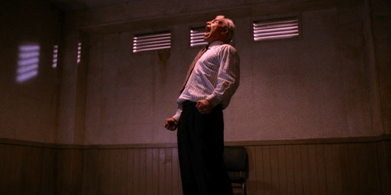 In Cooper’s dream the man danced, other clues laid out as well, kind of. “This Bob cant really exist, Leland is just crazy, right?” Crazed Leland recites poem including the line “Fire Walk with Me”, fire alarm and sprinklers go off, Wildman Bob Leland going full Shawshank, arms outstretched in the internal rain, Bob left him and he remembers “I killed my daughter! Forgive me!” Leland let the man in as a boy. Bob now wanted Laura, but she was too strong. Made Leland kill that girl Theresa (Cooper’s previous case?). So Bob was checking out Donna to be his next host body?