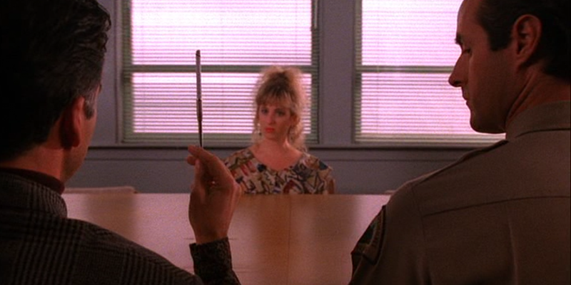 Audrey (Sherilyn Fenn) confronts her father (Richard Beymer) about One Eyed Jacks, reveals she was the white-masked Prudence! Ben taking this somewhat well. He’s owned OEJ for five years, he knew Laura worked there but only for a brief time, Emory sent her there. “Did you sleep with her?” Looooooooooong pause, sigh, “Yes”. “Did you kill her?” Another long pause – longer than it should be – “I loved her.” Forlorn Ben, the most emotional he’s been.