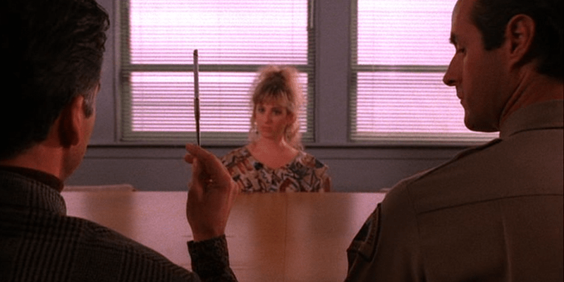 Opens with train screeching, whispering, hospital machine beeping, super slow spinning zoom out from hole-filled hospital ceiling tiles. Leland (Ray Wise) looks haunted, being read his rights, waives his right to an attorney. Outright admits to killing Jacques for killing Laura (based on the evidence that “he was arrested for it”). Dr. Hayward (Warren Frost) witnessing it all behind Leland. Afterwards, Deputy Andy (Harry Goaz) asks if he can retake the sperm exam he “flunked”, gives Andy a pot to go fill whilst Doc waits in the car. Andy of course bumps into Lucy (Kimmy Robertson), who finds his copy of Flesh World on the way to the restrooms, lol. Post-session, Andy trips and drops the sample pot under the chair, Cooper (Kyle MacLachlan) makes him freeze bent over to check out his boot tread. For most people this would be a notably embarrassing day, for Andy it’s just Wednesday. Cut to a waterfall, if I were in Andy’s position that’s all I’d need, no magazine required.