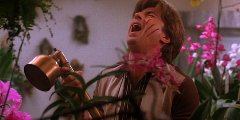 Immediate pickup from cliffhanger, Harold (Lenny von Dohlen) is still bleeding from his self-face claw, so if we’re sticking to the one-episode-a-day format then this must’ve happen at the stroke of midnight. “You are unclean, you have contaminated me!” James (James Marshall) storms in, knocks Harold down and they escape, without the diary. Donna (Lara Flynn Boyle) collapses into James’ arms. Donna watches on whilst Harold angry-spritzes his orchids and howls in pain. Never angry-spritz, in most cases you’ll do more harm than good.